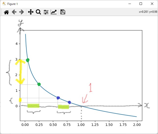 - xの0付近(緑点)は0.1や0.01のような小さな数値を2とか4とかの大きな数字に変換