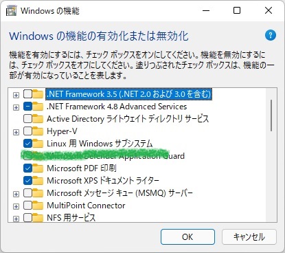 - 「Windowsの機能の有効化または無効化」画面を表示する