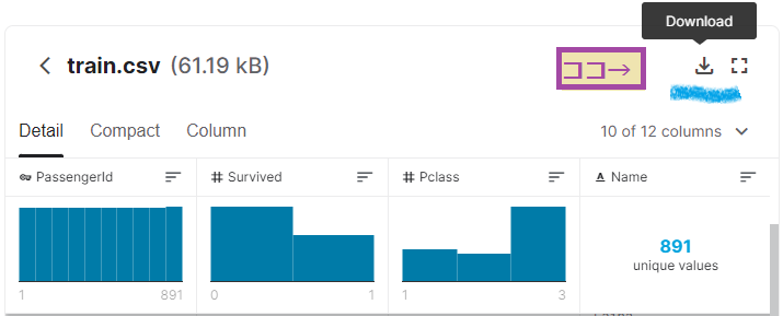 ◆Kaggleにログインして『Titanicデータ(CSV)』をダウンロード。