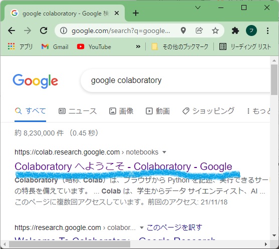 • パソコンのブラウザで「Google Colaboratory」で検索します