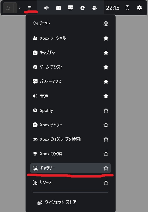 3×3の点格子のアイコン(ウィジェットメニュー)から「ギャラリー」を