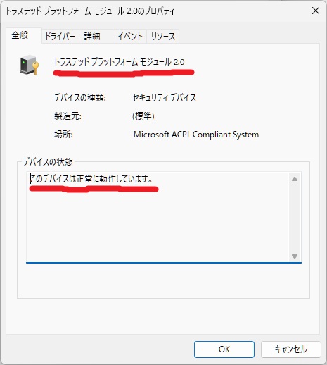 > 「トラステッド・・モジュール2.0」をダブルクリック - 「デバイスの状態」で正常に動作していることを確認