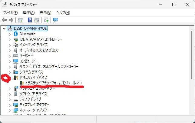 - 「セキュリティデバイス」の「>」をクリックして展開